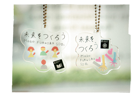 また廃棄予定となっていたアクリルパーテーションをキーホルダーにアップサイクル。福岡の子どもたちが、SDGsの17の目標に合わせて作ってくれた切り絵をあしらった、17種類のかわいいキーホルダーを制作し、ガチャガチャでプレゼント。SDGsの17の目標をたくさんの子どもたちに知ってもらうことができました!