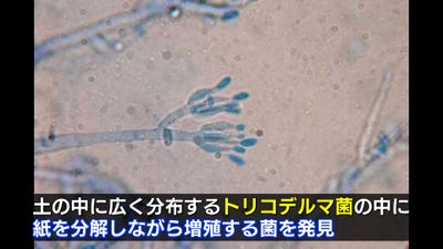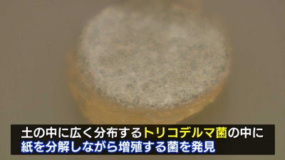 微生物の研究を重ねた結果、土の中に広く分布する「トリコデルマ菌」という細菌の中に、紙を分解しながら増殖する菌がいることを発見。最も効率よく分解する菌に「911株」という名前を付けました。