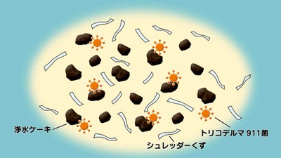 「トリコデルマ911菌」は「浄水ケーキ」をすみかにして、えさとなるシュレッダーくずを分解・吸収することで増えると考えられています。材料を混ぜて1か月ほど寝かせることで、農作物の成長を助ける菌がぎっしりと詰まった「土壌サプリメント」が完成します。