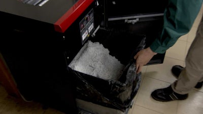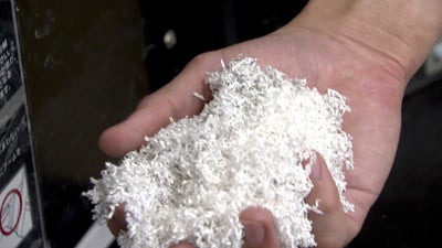 機密文書などを裁断するシュレッダー。裁断されたくずは、繊維が短く切れてしまっているため、紙としてリサイクルすることは難しく、多くは燃やされているのが現状です。