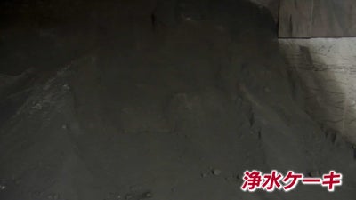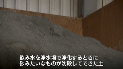 大石物産 大石倫斗品質管理室長「こちらが浄水ケーキになります。飲み水の方を浄水場で浄化するときに、砂みたいなものが沈殿してできた土になります」