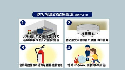 具体的には商店街の組合などと連携して、火災警報器や消火器の設置、地域ぐるみの訓練など重点的な防火指導を行います。