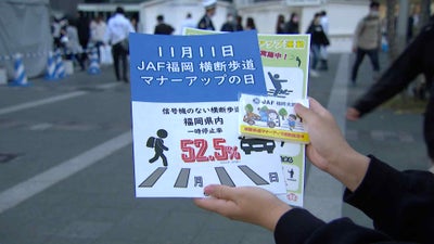 記念日を設けたのは企業だけではありません。JAF福岡支部は、横断歩道の白いラインを数字の1の羅列に見立てて、「横断歩道マナーアップの日」の啓発活動を実施しました。JAFの調査によると、信号機のない横断歩道を歩行者が渡ろうとしているときに、車が一時停止した割合は福岡県で52.5%。全国平均より高いものの、半数近くは止まってくれないのが実情です。