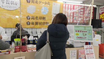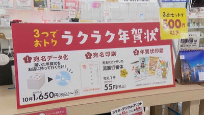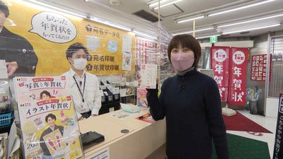 来店客「自分でやるのは面倒くさいから、ここでやると宛名もやってくれるみたいですから楽ですね」裏面のデザインは1000種類以上。宛名のデータ化は2~3日かかりますが、印刷は最短1時間で仕上がるということです。注文は10枚から可能で、100枚発注した場合は、はがき代も含めて2万4800円からとなっています。