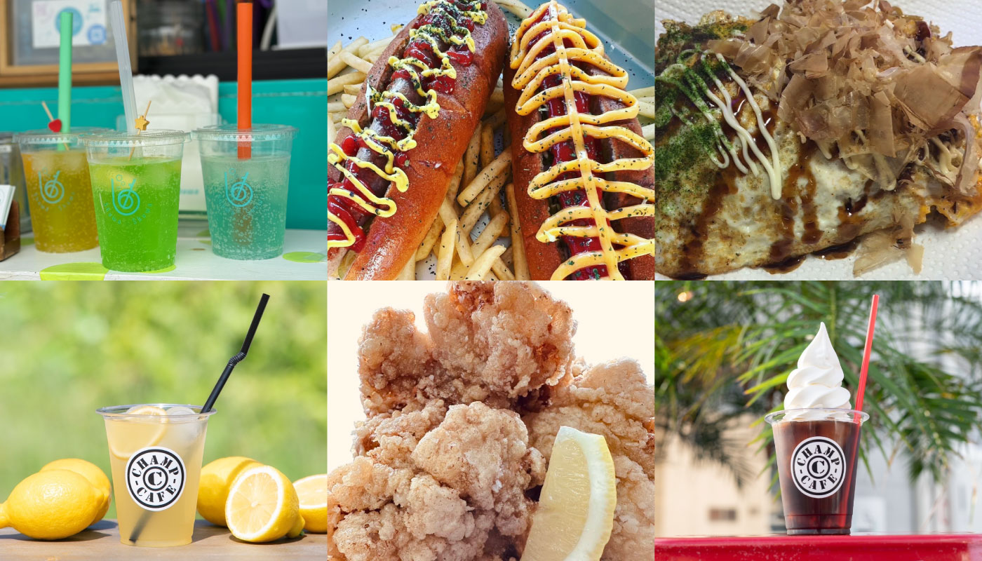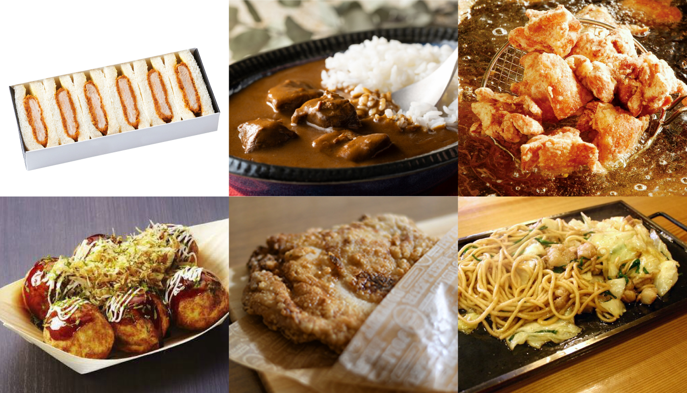 「とんかつ濵かつ」のヒレかつサンド、贅沢な大人のビーフカレー、国産牛ホルモンの焼チャンポン炒めに、かしわ飯弁当、店主自慢のお好み焼きに、ふっくらジューシーなから揚げ。美味しいものがいっぱい!冷たいドリンクと一緒にどうぞ。