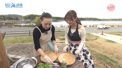 ▼HKT48の大庭凜咲が、道の駅むなかたの新鮮な魚を使った生春巻きづくりに挑戦!