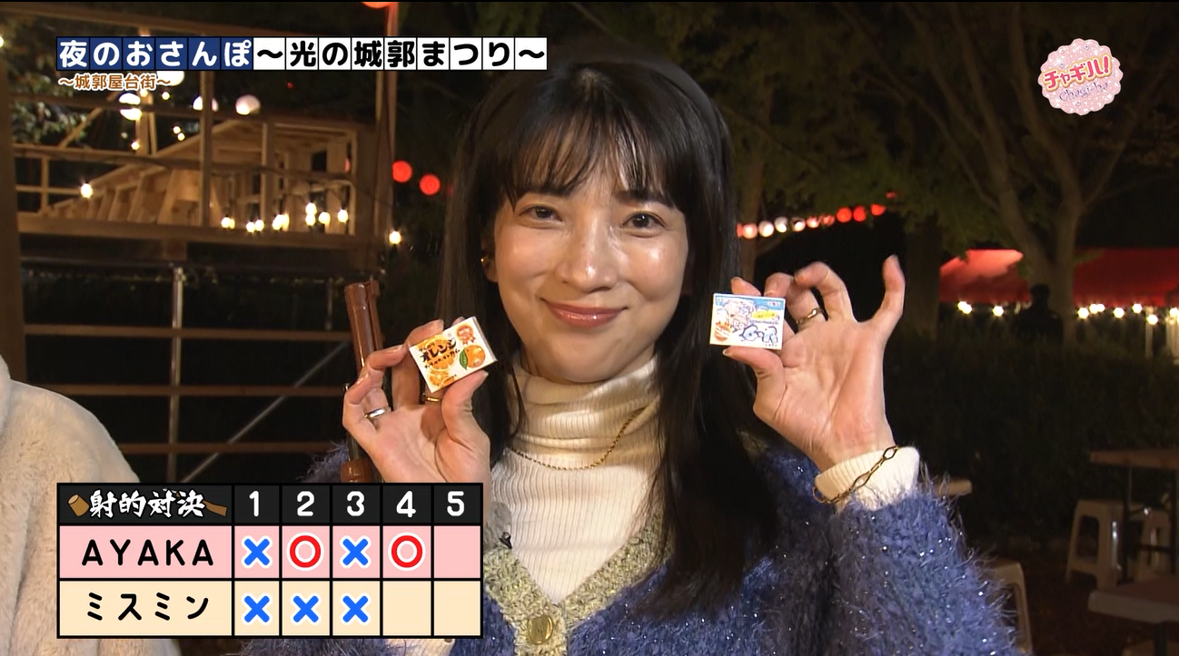 ラストは、デザートをかけて、AYAKAとミスミンが射的で対決です。
