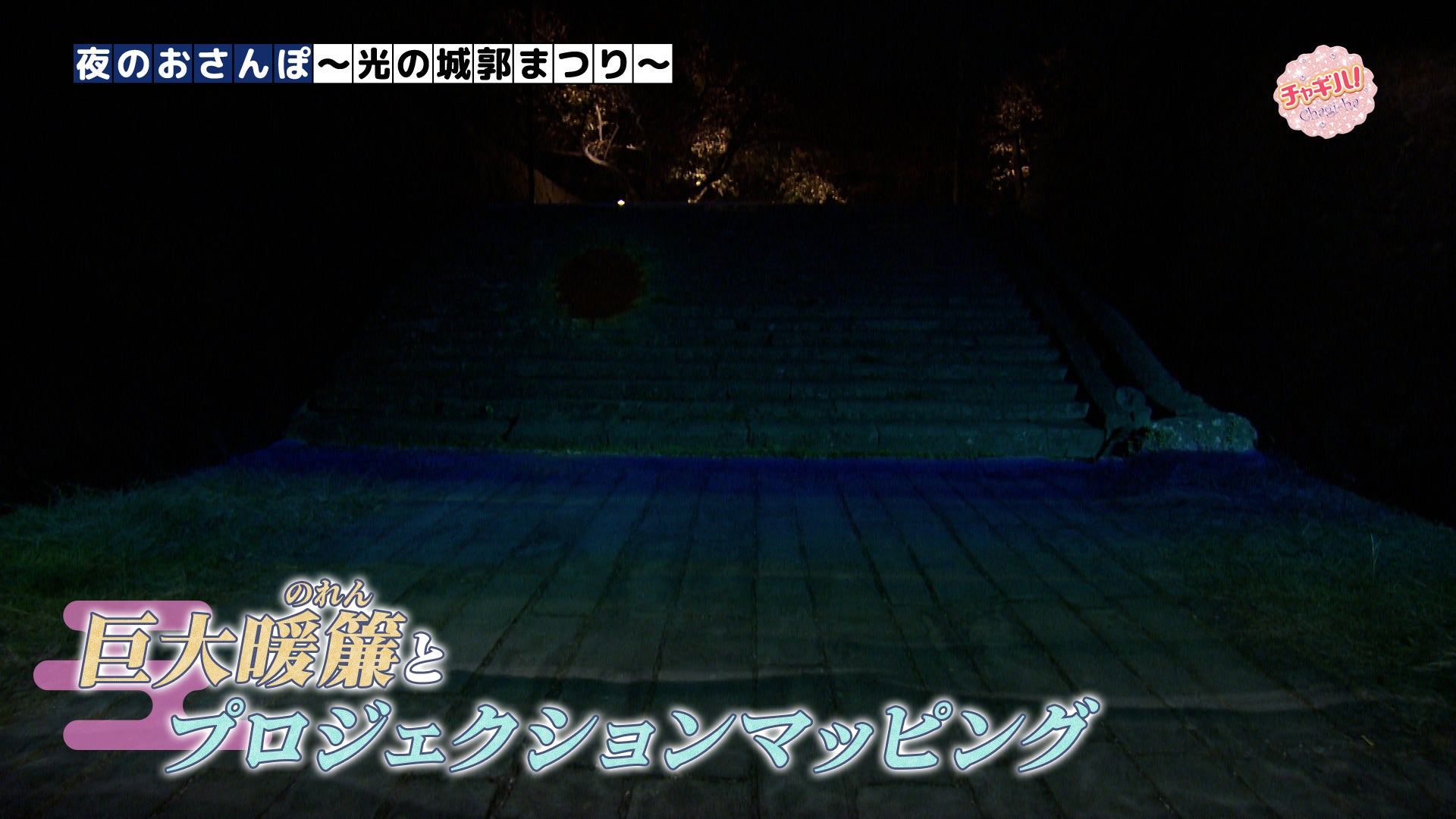 黒田家の家紋が描かれた、巨大な暖簾をくぐると、石段を使ったプロジェクションマッピングが楽しめます。