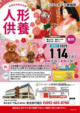 ベルコシティホール東福岡にて大切な人形やおもちゃに感謝を込めて「人形供養祭」を1月14日開催
