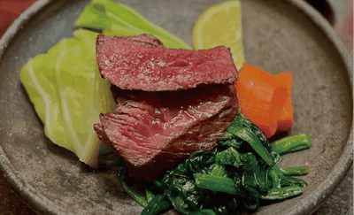 今回は西中洲で壱岐牛、タンの味噌漬け、タン刺し、ランプたたき、テールスープ、イチボのレアステーキ